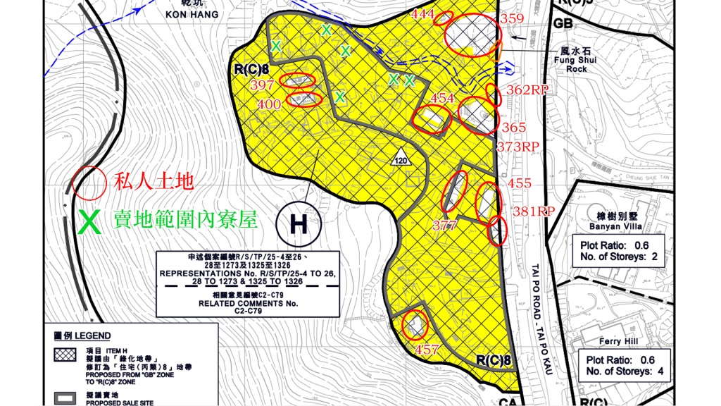 由於我們曾向規劃署索取放大版的分區規劃大綱圖被拒,只能根據2014年城規會文件調查,發現今次政府賣地範圍、以至被納入開發計劃的土地,「剛好」避開了上述私人土地地段。當中受影響的村民,大部分都居住在政府土地上的牌照土地及牌照屋,當中亦有部分是永久屋。