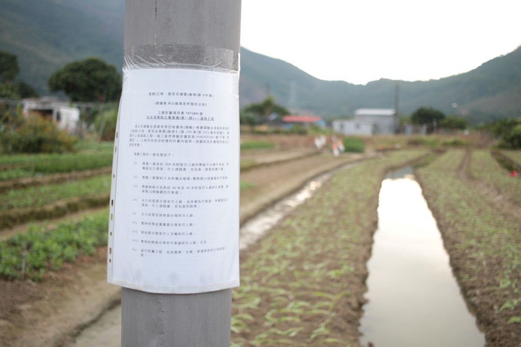 地政總署8月尾撤銷蕉徑農業園道路工程範圍的批租租約,並即將展開青苗補償等收地程序,清除農作物和雜物,申訴期限將於9月10日屆滿,響起蕉徑農區的警鐘。農業園未起,推土機卻要先將農田推平變石屎路,實在諷刺。