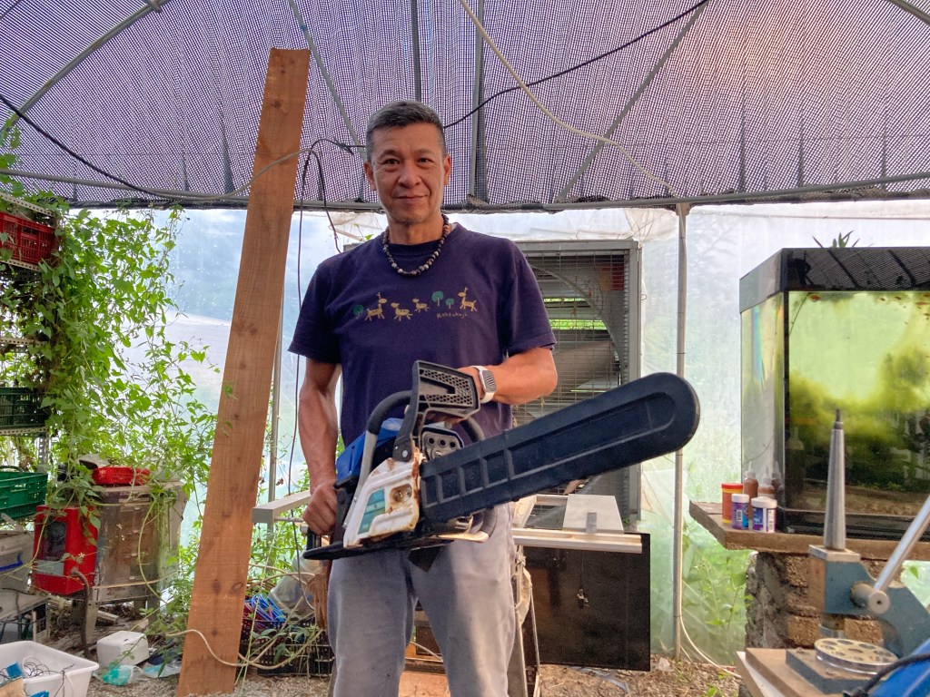 在坪輋經營魚菜共生農場已經四年的張貴財(財哥),為我們介紹他使用的各種電鋸。利用棕地做陶粒種植魚菜共生系統,固然需要用到很多電器去開料。但財哥認為土耕農夫也需要懂得木工,除了鋸樹斬樹,也可以利用鄉村經常出現的棄置卡板、木材加固農場野豬欄等用途。