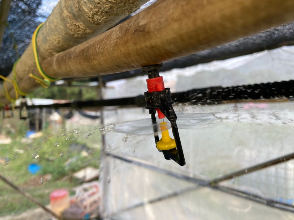 將水過濾之後,就可以駁上架做高空噴灑。噴灑全都是噴霧模式,噴落培苗位置相對平均,水也不會太大滴,滴散裡面的泥:「要留意停水後水有機會慢慢滴落去,垂直的位置就不要放培苗盤,要放開少少,要放在滴不到的位置。」