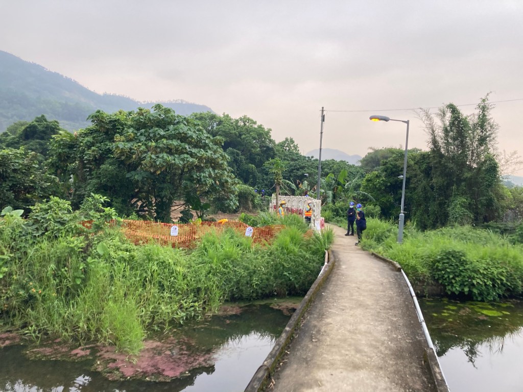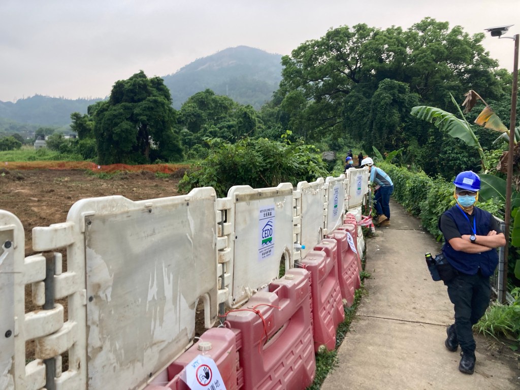 我們是大約4:30收到戚師傅的消息,趕到現場後發現工人已將農地圍上水馬,亦以地盤範圍為由阻止其他人進出,指已安裝cctv作監視。土木承判商又稱,地政聯同漁護署等部門上午已進入農田範圍自行點算青苗,然後土木工程拓展處才通知承判商入場動工。根據承判商講法,當戚師傅下午收到電話(而且是2字頭電話)時,地政和漁護已完成青苗點算。