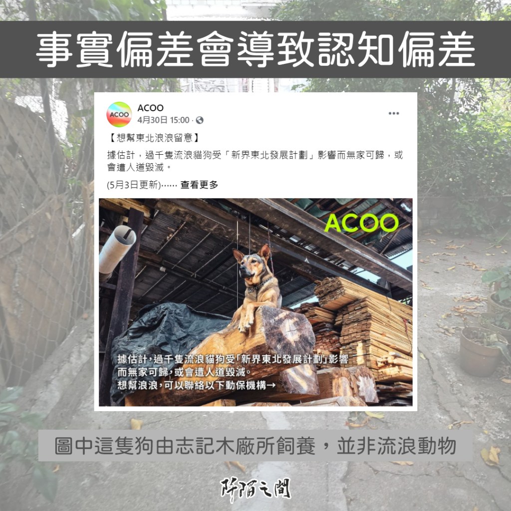 首先要指出ACOO的發文中,那隻伏在木材間的狗叫「燒賣」,是 志記鎅木廠3-4年前開始飼養,上過木工班、去過木廠參觀的朋友都會認得。你可以話圖錯不緊要,資訊正確便可以,但這張錯誤配圖,會令人誤以為木廠打算將牠棄養,使廠戶蒙上不白之冤。