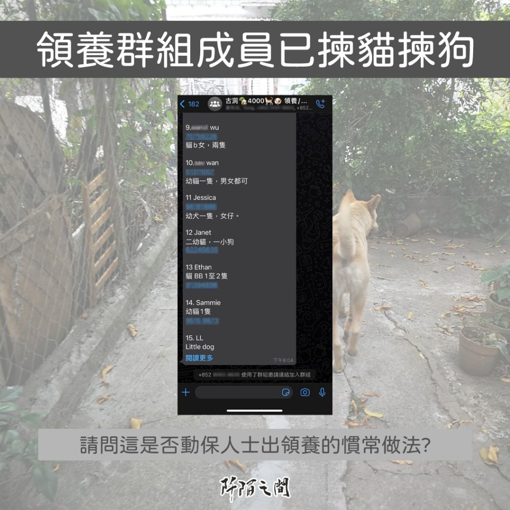 即使是「實事求事」去處理動物迫遷的問題,但據進入了那些最近開設的領養群組的伙伴轉述,組內已有人陸續提出「自己想領養」的貓狗size、數量。這個情況是否動保界的慣行做法?如是,那到底這些人是抱著甚麼心態去做這件事?