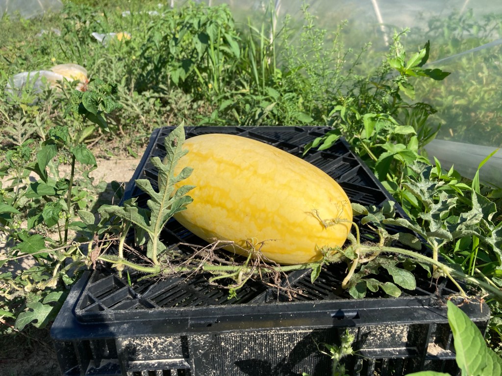 今茬西瓜比較少幫手,所以沒有太多親身體會分享。如果做「生產」才是我們想做的事,克服量產帶來的病蟲害,就是工作的一部分。綜合農友經驗,難度和辛苦位是除了授粉(農場有蜜蜂幫手),西瓜的果在雌花處慢慢長大,沒有網棚的種地隊要逐個包網袋防果蠅、然後也要換更大的網袋,經常深蹲確實很辛苦,但不做的話,就很容易令果蠅有機可乘。