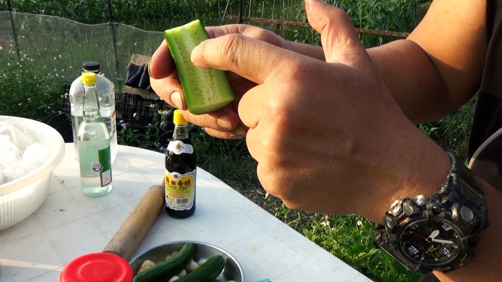 先將放在密實袋裡面,然後灑少少鹽、關上袋,再用刀或麵粉桿去拍,將它揼扁少許,不要太大力,目的是要壓到它中間碎開少少,並非要粉碎,然後一路搓。隔了5分鐘後,由於鹽的滲透作用,會將些汁滲出來,令到一陣間醃它的時候,青瓜不會太多水,更容易入味。