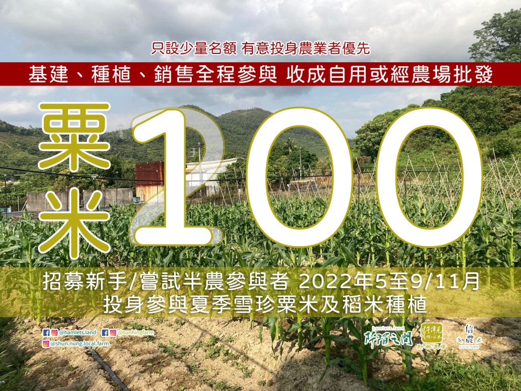 而報名今期粟米100的朋友,亦代表同時參與8月牛潭尾信心米的插秧、9-10月田間打理、11月收割三次行程。另外每次入農場都可以以優惠價,向新興各字號農友購買新鮮農作物。